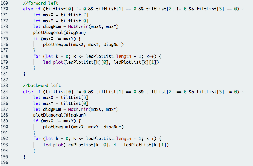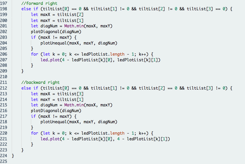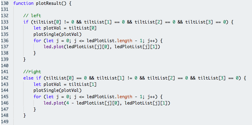 PlotResult() contains multiple if conditions that check the kind of tilt and plots the LED matrix accordingly using led.plot(x, y). The possible combinations of tilt are:
