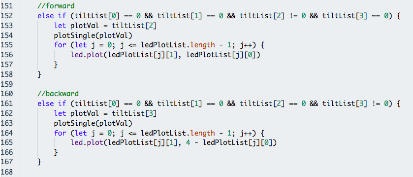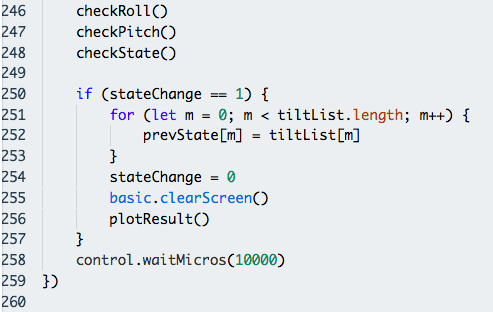 We then run the necessary functions according to our code flow in Step 0 and check for a state change (meaning that there has been a change in the tilt of the micro:bit since the last iteration).