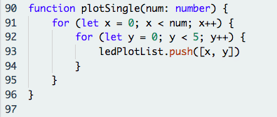 ledPlotList: Array of arrays of led coordinate to be plotted in the form (x, y). To define an array of arrays, we use the type number[][] to indicate a nested array of variables of type: number.
