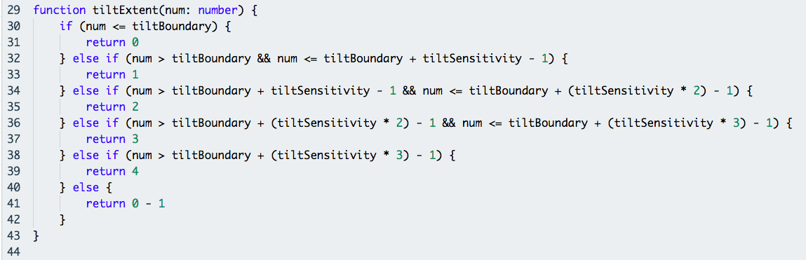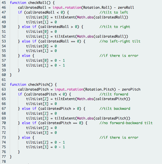 Instead, a function tiltExtent() takes the parameter num, which refers to the tilt value from the accelerometer, and converts these tilt values (num) to tilt levels from 0 to 4. 0 indicates no tilt in the given direction and 4 indicates very large tilt, while -1 is returned when there is an error.