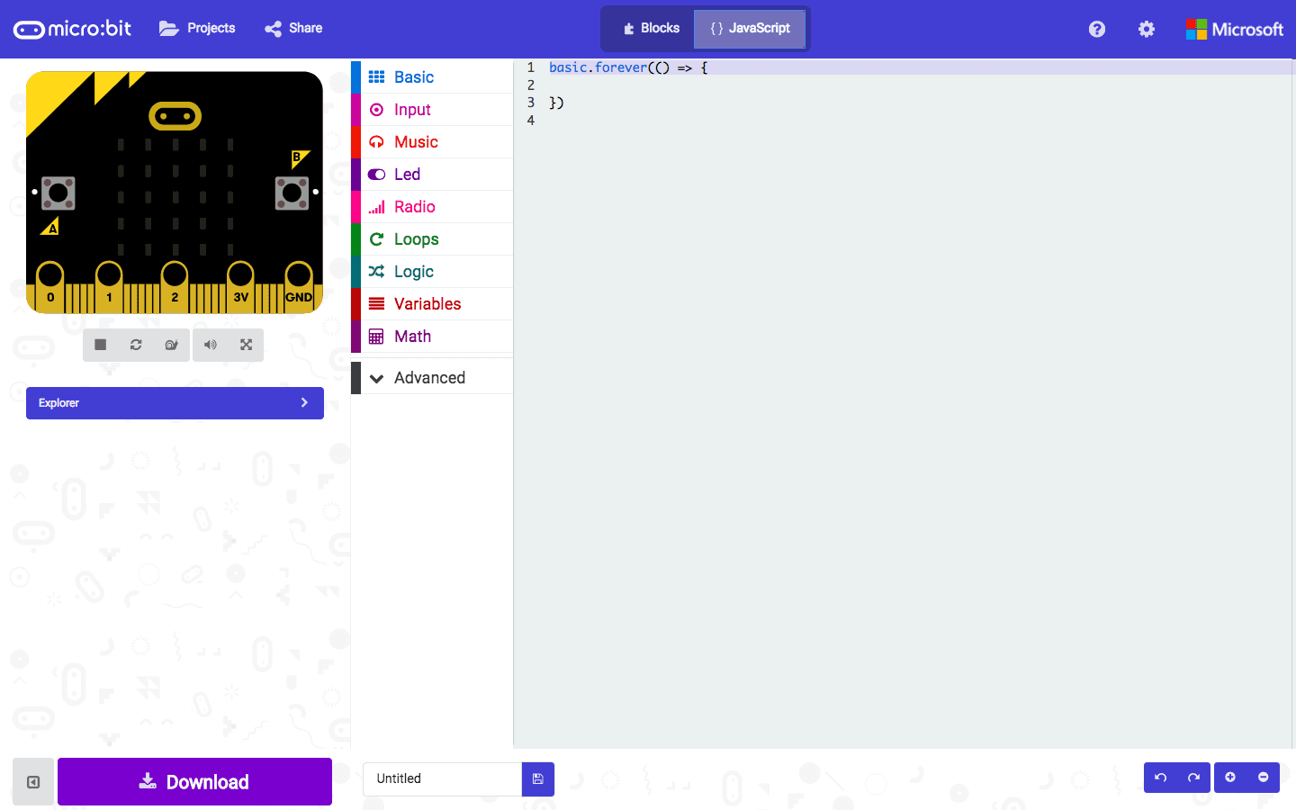 Access the javascript editor for the micro:bit at makecode.microbit.org.