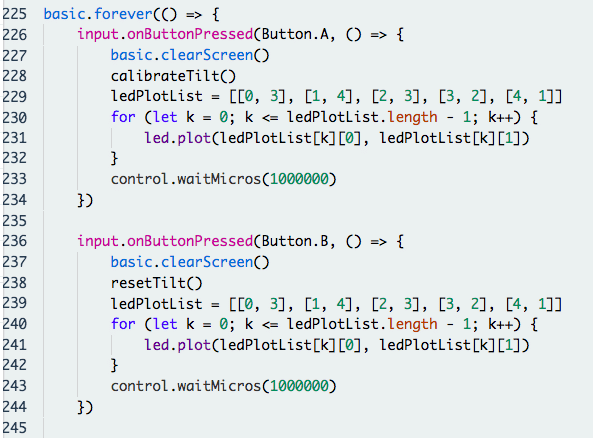 We first set the buttons A and B on the micro:bit to the calibTilt() and resetTilt() functions respectively using input.onButtonPressed(), and plot a tick on the LED matrix when the calibration is complete.
