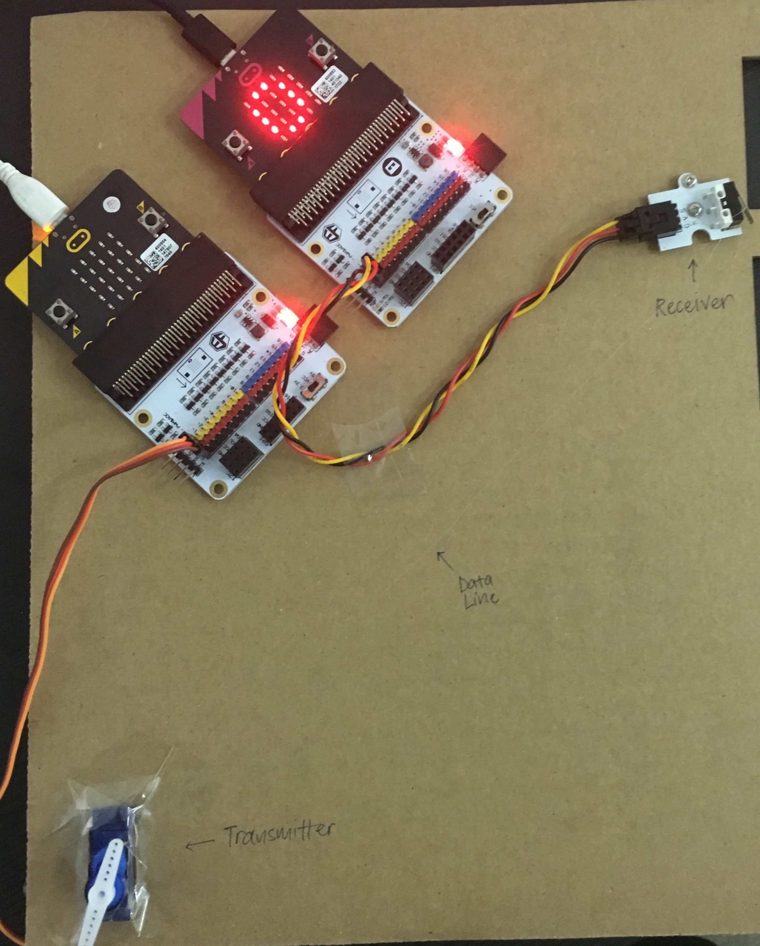 Attach the servo to the cardboard sheet, and tie the string around the end of the rotor attached to the servo. Tie the other end of the string around the metal flap of the crash sensor. Attach the crash sensor at a distance such that when the servo turns, the string is pulled and the sensor is activated. If you don’t have a cardboard sheet, you could tape everything to a table. For the transmitting micro:bit, attach the servo to pin 0 on the breakout board. For the receiving micro:bit, attach the crash sensor to pin 0 on the breakout board.
