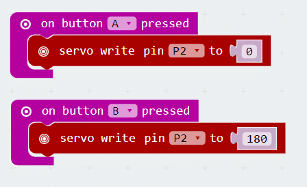 With your servo firmly in place – code the micro:bit to turn your servo to 0 deg when button A is pressed, and to turn to 180 deg when button B is pressed.