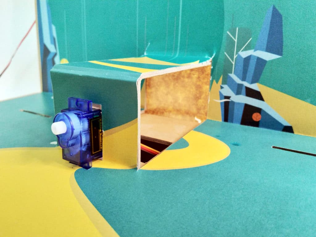 Fit the servo motor into the hole at the pop-up center.